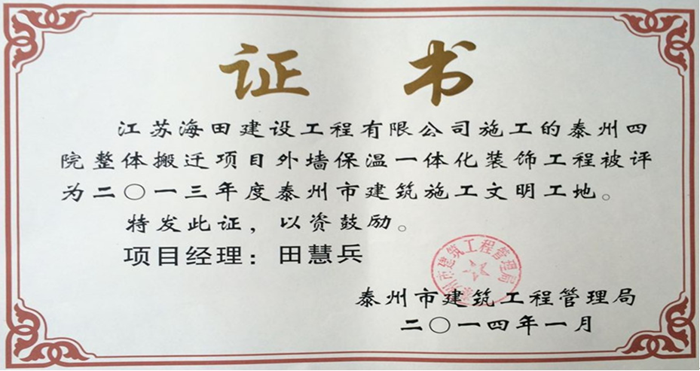 熱烈祝賀我公司承建的四人醫被評為“泰州市建筑施工文明工地”